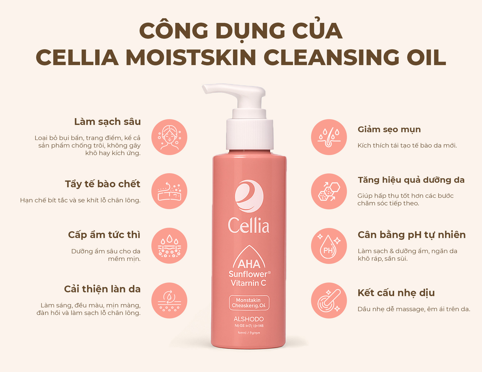Với khả năng làm sạch tối ưu và nuôi dưỡng da, dầu tẩy trang Cellia chứa các thành phần nổi bật:
