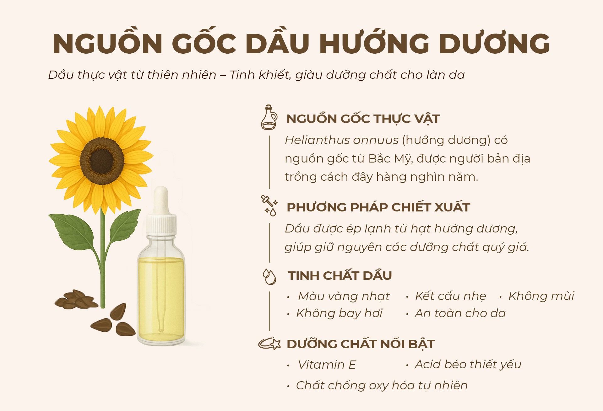 Hoa hướng dương một loài thực vật có hoa lớn có nguồn gốc từ Bắc Mỹ, được người bản địa trồng cách đây hàng nghìn năm. Chiết xuất dầu hướng dương (Helianthus annuus) một loại dầu thực vật tự nhiên thu được bằng phương pháp ép lạnh từ hạt của cây hướng dương. Loại dầu này có màu vàng nhạt, kết cấu nhẹ, giàu dưỡng chất, không mùi, không bay hơi và an toàn khi sử dụng trên da. Quá trình ép lạnh giúp giữ nguyên các dưỡng chất quý giá như Vitamin E, Acid béo thiết yếu và các chất chống oxy hóa, đảm bảo độ tinh khiết và hiệu quả cao trong chăm sóc da.