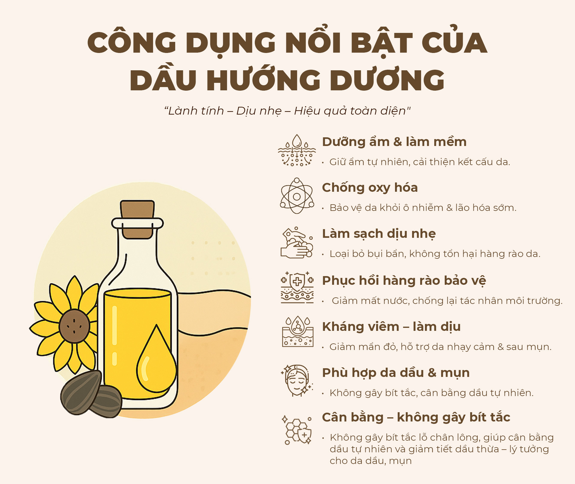 Dầu hướng dương có khả năng hòa tan hiệu quả lớp trang điểm, bã nhờn và bụi bẩn mà không làm tổn thương hàng rào bảo vệ da. Với hàm lượng cao linoleic acid (khoảng 59%), nó giúp làm sạch da một cách nhẹ nhàng, phù hợp với cả làn da nhạy cảm và dễ bị mụn .
