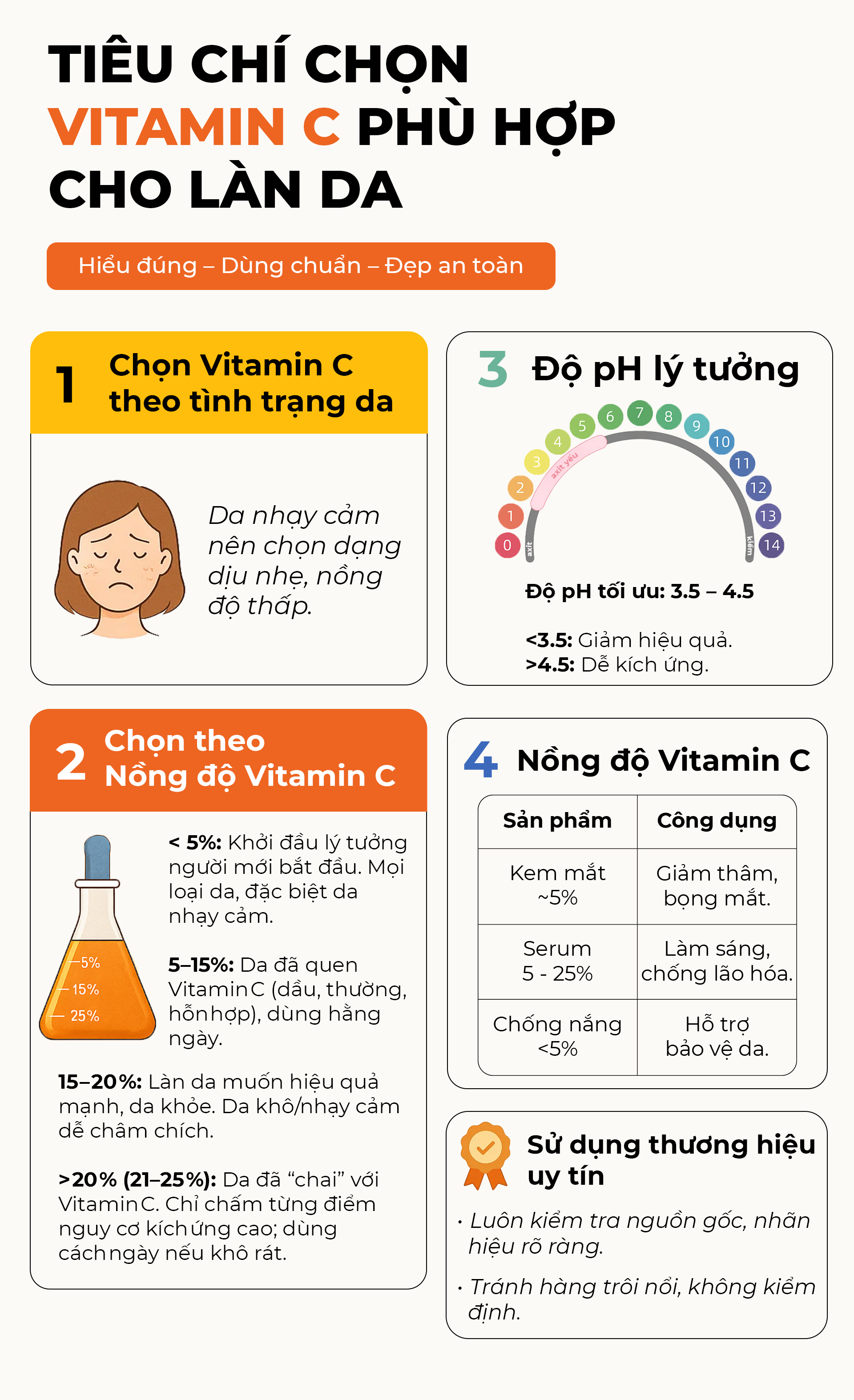 - Chọn loại Vitamin C có nồng độ an toàn cho da: