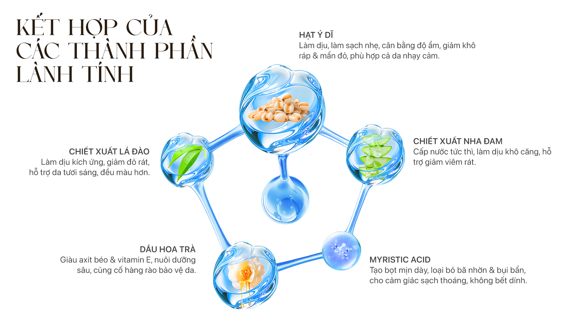 - Chứa thành phần làm sạch dịu nhẹ: các hoạt chất tạo bọt và loại bỏ bụi bẩn nhưng vẫn giữ được lớp màng ẩm tự nhiên của da.