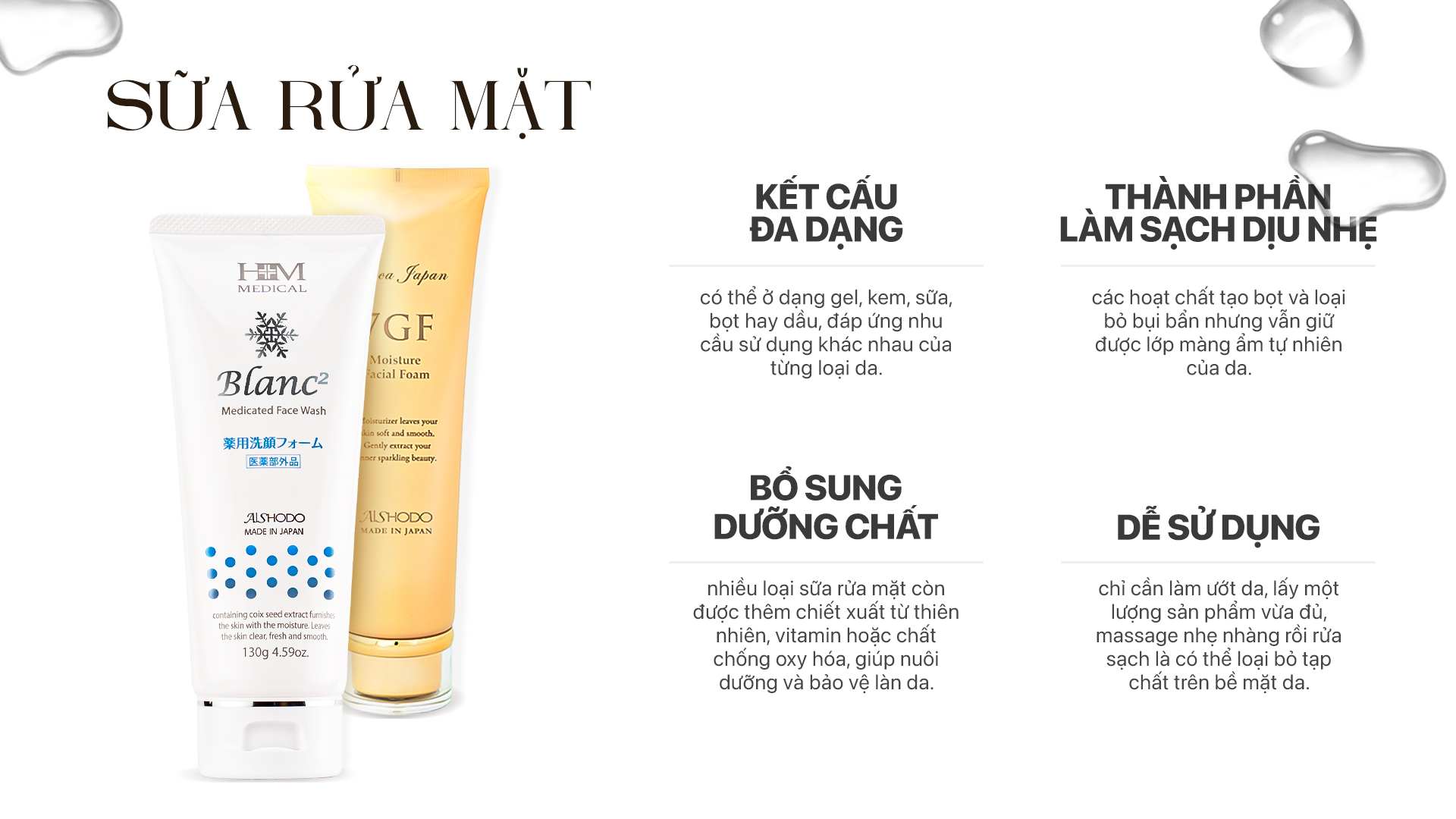 - Kết cấu đa dạng: có thể ở dạng gel, kem, sữa, bọt hay dầu, đáp ứng nhu cầu sử dụng khác nhau của từng loại da.