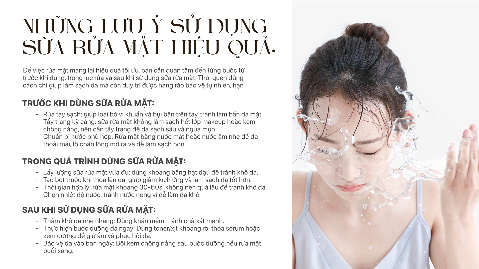 Để việc rửa mặt mang lại hiệu quả tối ưu, bạn cần quan tâm đến từng bước từ trước khi dùng, trong lúc rửa và sau khi sử dụng sữa rửa mặt. Thói quen đúng cách chỉ giúp làm sạch da mà còn duy trì được hàng rào bảo vệ tự nhiên, hạn chế mụn và lão hóa sớm.