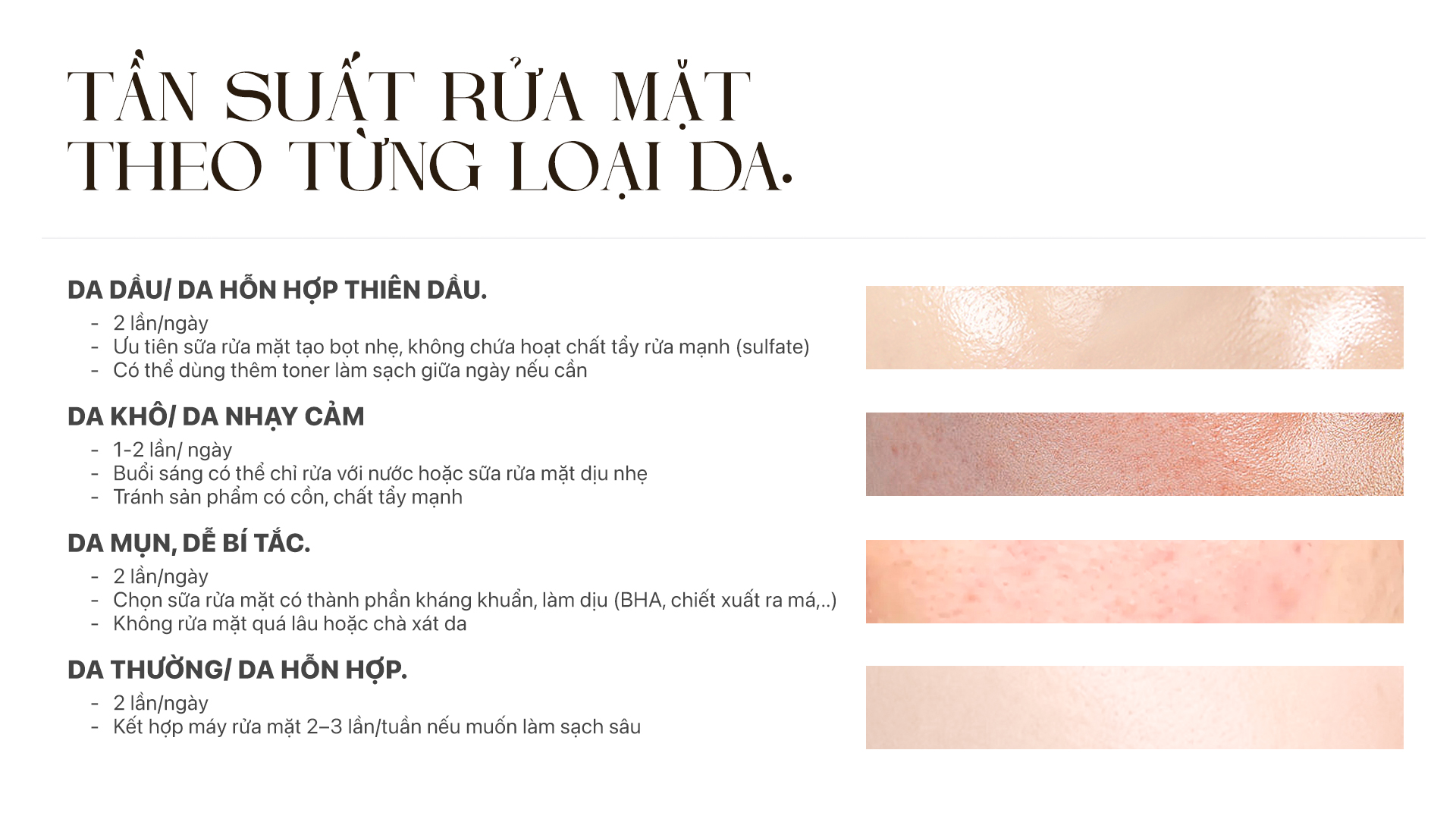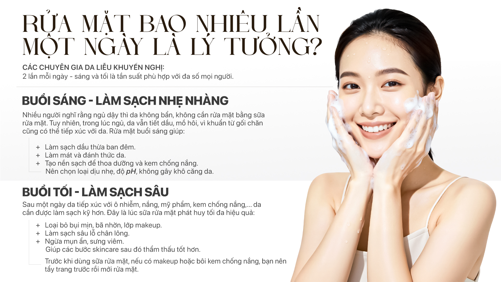 Các chuyên gia da liễu khuyến nghị: 2 lần mỗi ngày - sáng và tối - là tần suất phù hợp với đa số mọi người.