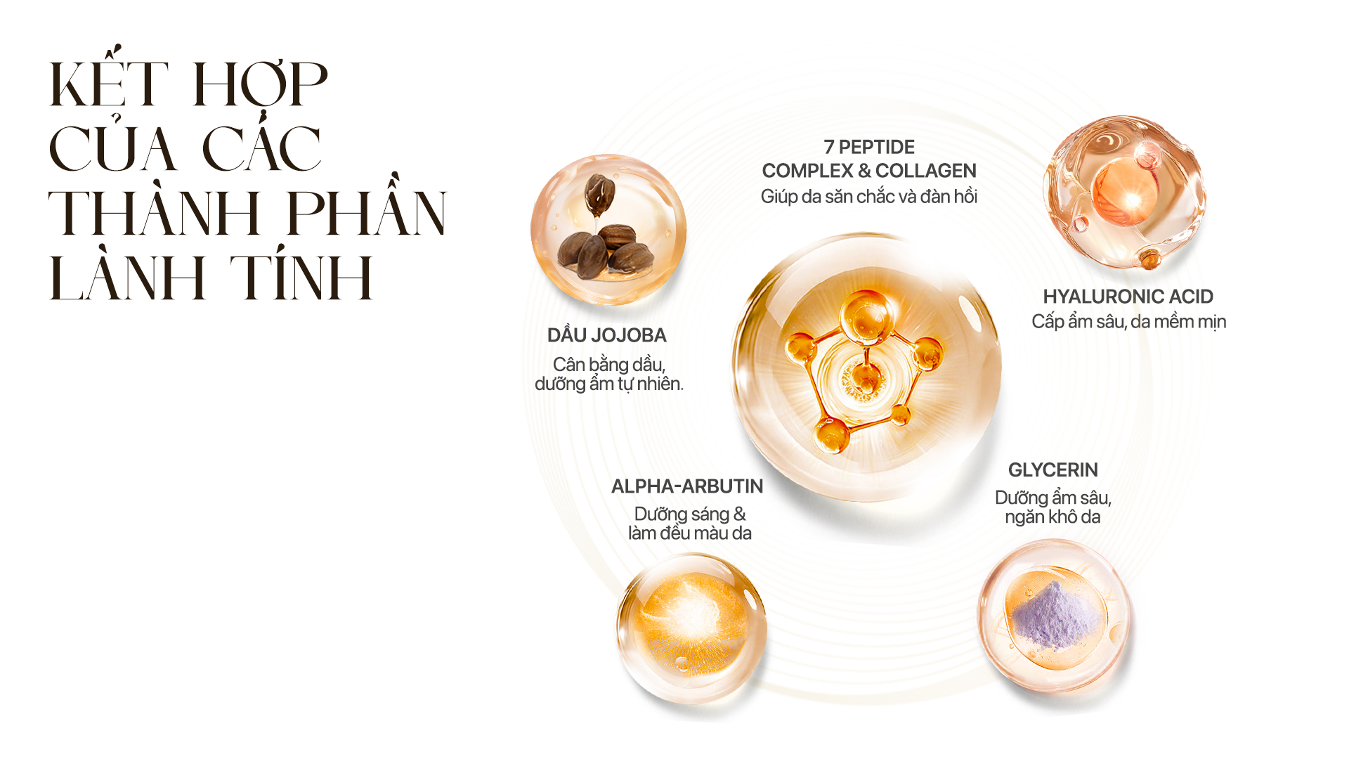 - 7 Peptide Complex & Collagen: Hỗ trợ tái tạo và phục hồi da, góp phần duy trì độ đàn hồi, giảm dần sự xuất hiện của nếp nhăn và mang lại làn da săn chắc, tươi trẻ hơn.