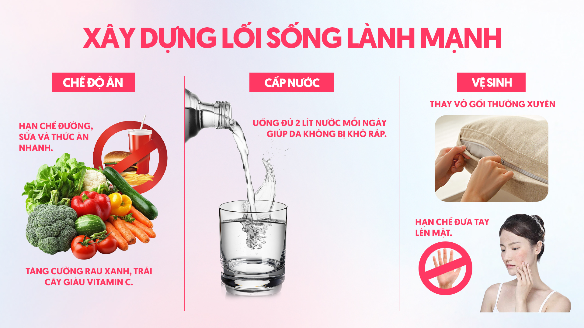 - Cấp nước: uống đủ 2 lít nước mỗi ngày giúp da không bị khô ráp.