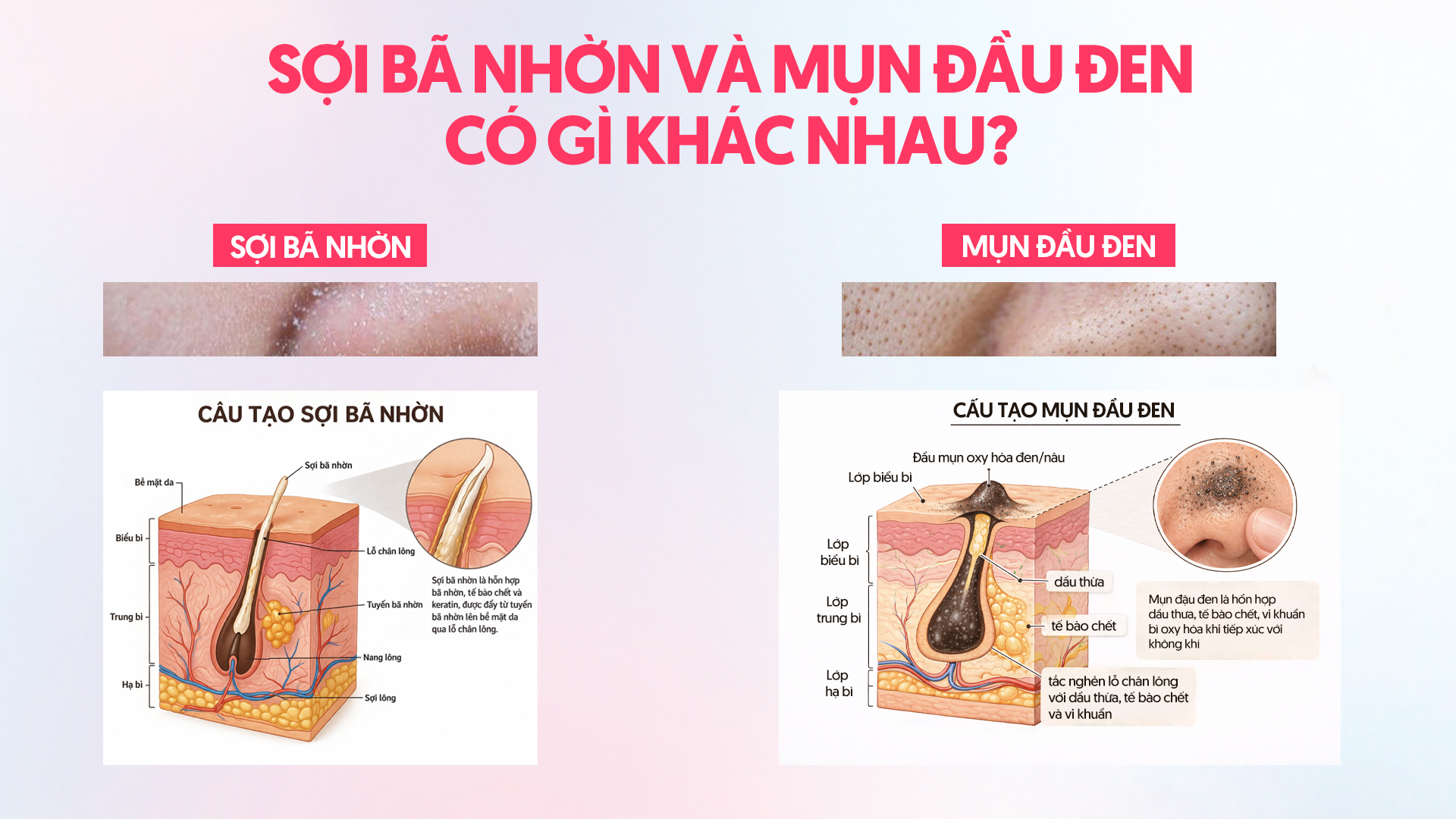 Sợi bã nhờn là một phần của da, trong khi mụn đầu đen là vấn đề cần “dứt điểm”. Bằng cách kết hợp các bước làm sạch chuyên sâu và sử dụng sản phẩm hỗ trợ, bạn hoàn toàn có thể tự tin với làn da láng mịn, sạch mụn ngay tại nhà.